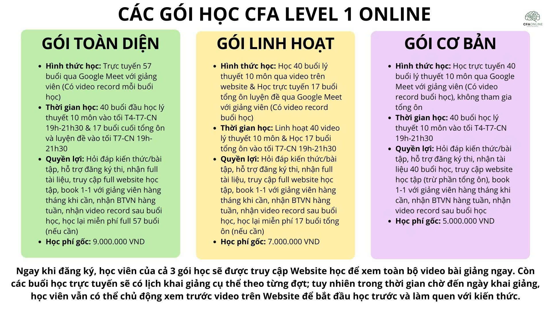 - Gói Toàn Diện (Đây là gói học được HIGHLY RECOMMEND cho các bạn lần đầu tiếp cận CFA Level 1 và chưa biết cách học hiệu quả): Phù hợp với các bạn chưa có nền tảng tài chính, cần một lộ trình học đầy đủ từ đầu đến cuối và có giảng viên đồng hành sát sao. Gói này cũng phù hợp với các bạn khó tự học một mình, cần lịch học cố định và sự thúc đẩy từ lớp học để duy trì tiến độ. Ngoài ra, học viên muốn được luyện đề kỹ và có cơ hội học lại miễn phí nếu cần cũng nên chọn gói này.